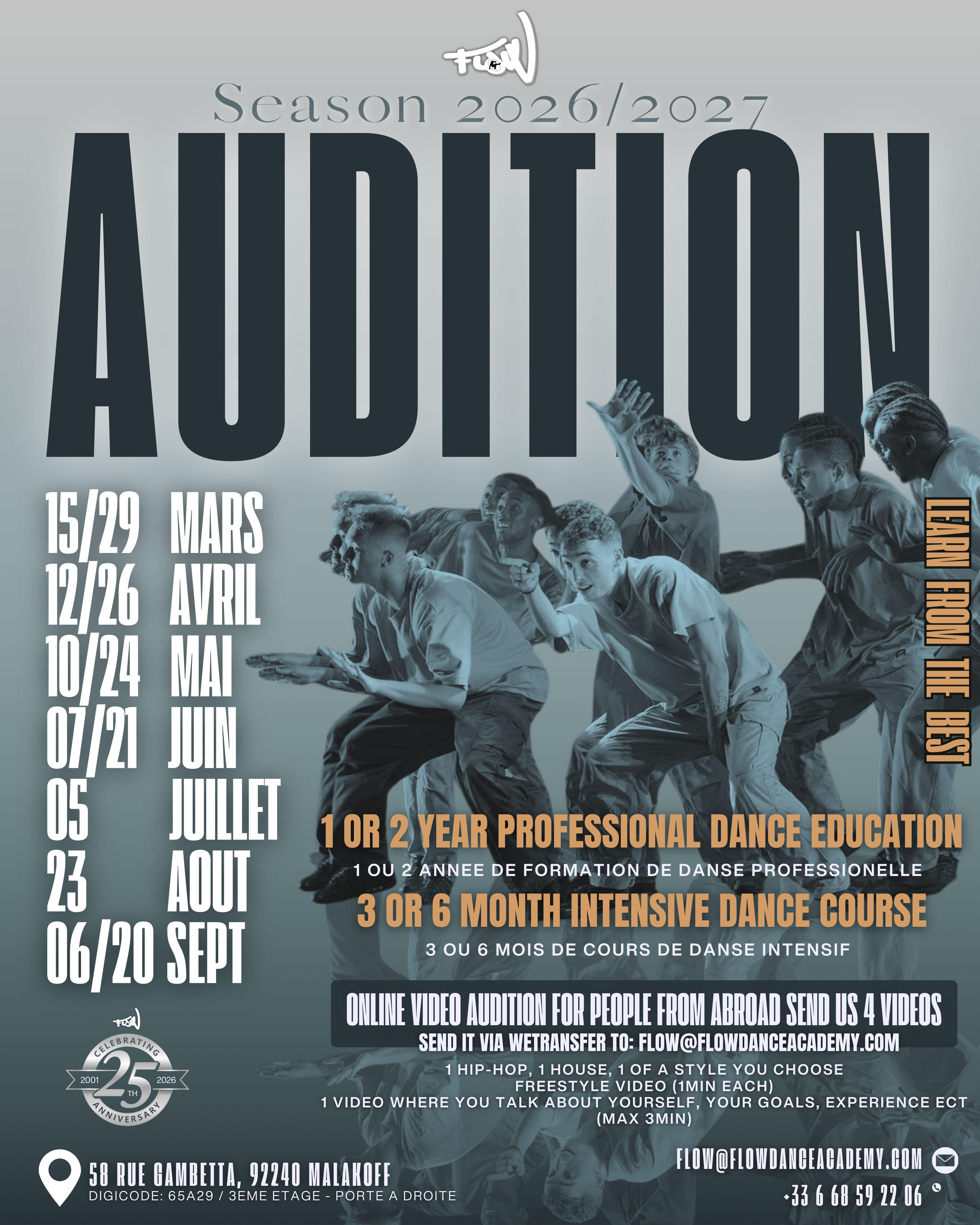 Every year Flow Dance Academy will have audition in France for our 1 or 2 years Professional dance education or 3 OR 6 Month intensive cours in Paris